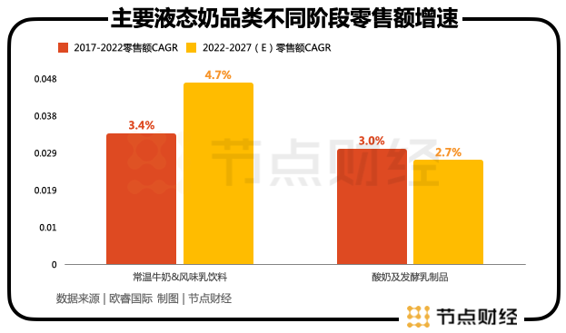 歐睿國(guó)際預(yù)測(cè):2022年-2027年,上述兩大細(xì)分品類的市場(chǎng)規(guī)模復(fù)合增速分別為2.7%與4.7%。言外之意是“常溫牛奶與風(fēng)味乳酸飲料”增速還將進(jìn)一步放緩,酸奶有小幅提升。