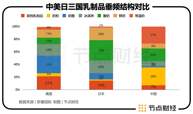 而我國(guó)2022年排名最靠前的三大乳制品品類是“常溫奶(27%)、嬰幼兒奶粉(25%)、酸奶(20%)”