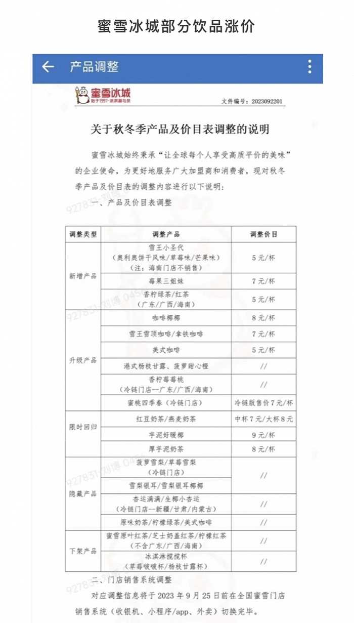根據(jù)社交平臺流傳的一份蜜雪冰城內(nèi)部文件《關(guān)于秋冬季產(chǎn)品及價目表調(diào)整的說明》顯示,蜜雪冰城全國門店新增了3款產(chǎn)品,升級6款產(chǎn)品,限時回歸3款產(chǎn)品,隱藏4款產(chǎn)品,下架2款產(chǎn)品。對應(yīng)調(diào)整于9月25日在全國蜜雪冰城門店銷售系統(tǒng)切換完畢。
