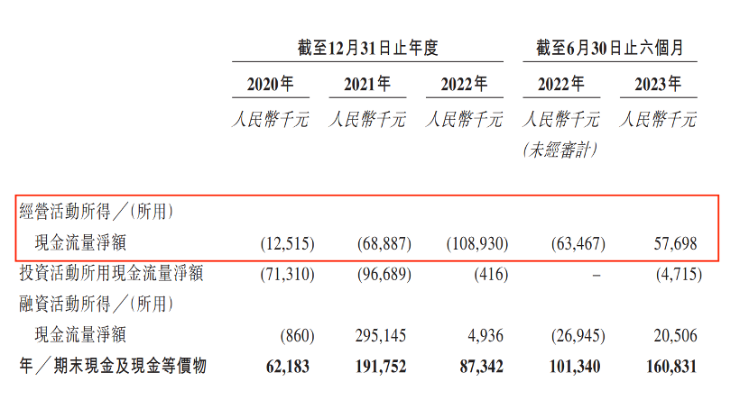 招股書顯示,2020年-2023年6月,其經(jīng)營(yíng)現(xiàn)金流凈額分別為-1251.5萬(wàn)元、-6888.7萬(wàn)元、-1.09億元、5769.8萬(wàn)元。