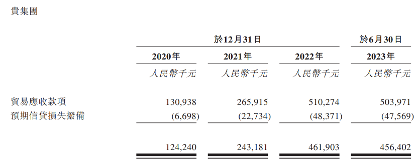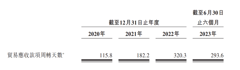另一個(gè)影響現(xiàn)金流轉(zhuǎn)化的關(guān)鍵指標(biāo)就是應(yīng)收賬款。2020年-2023年6月,其貿(mào)易應(yīng)收款項(xiàng)分別為1.24億元、2.43億元、4.62億元、4.56億元。
