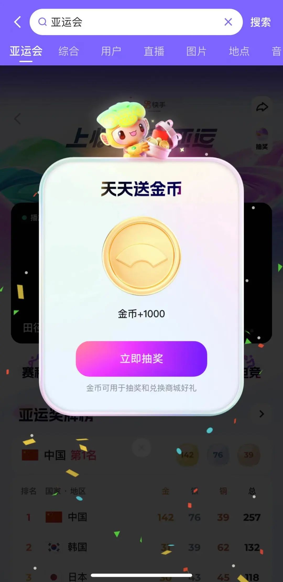 短視頻平臺的互動優(yōu)勢,快手同樣沒有忽視。本屆亞運(yùn)會期間,快手用戶可以參與亞運(yùn)相關(guān)的話題挑戰(zhàn)、助威特效視頻活動,也可以參與亞運(yùn)抽獎。每當(dāng)中國隊斬獲金牌,快手用戶就可以領(lǐng)取金幣并參與抽獎,贏得品牌獎券、實體獎品等獎勵。
