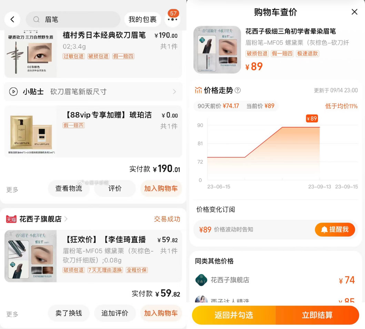 注:左為某消費(fèi)者在微博曬出的消費(fèi)記錄;右為花西子眉粉筆淘寶購物車價(jià)格走勢圖,保存于9月15日。