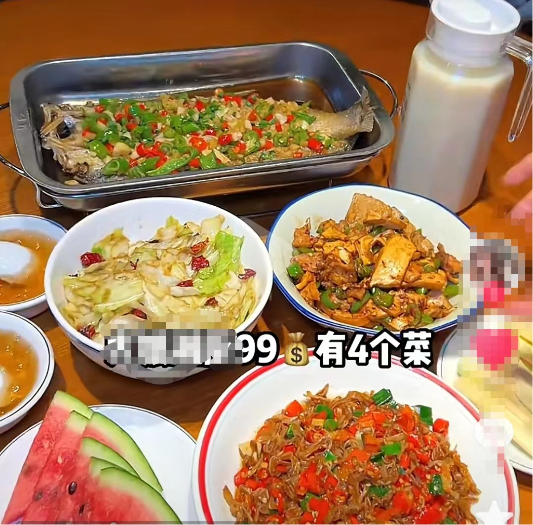 “兩道硬菜,兩道素菜,送茶位送甜品,免費(fèi)米飯、水果、飲品,只要99元?”