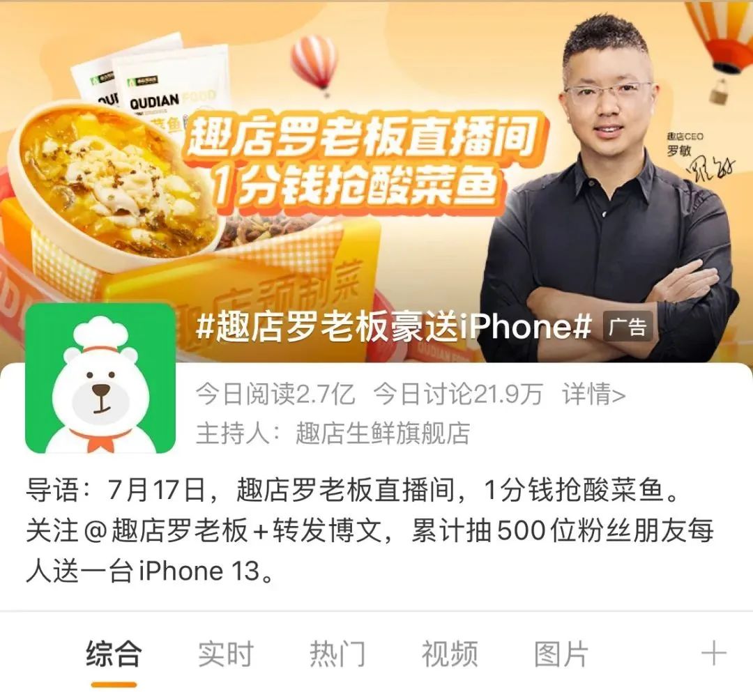 2022年7月,趣店集團(tuán)旗下“趣店預(yù)制菜”品牌正式發(fā)布,羅敏花費(fèi)2億元在直播平臺(tái)掀起鋪天蓋地的推廣,還邀請(qǐng)了傅首爾、賈乃亮等達(dá)人助陣。在真金白銀的聲勢(shì)下,趣店預(yù)制菜單日售出956萬(wàn)份,新增粉絲397萬(wàn),場(chǎng)觀人次達(dá)9587萬(wàn)。