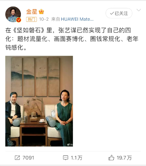 今年國(guó)慶檔電影中,口碑爭(zhēng)議最大的電影要屬票冠《堅(jiān)如磐石》,前幾天金星曾痛批該片“題材流量化、畫面賽博化、圈錢常規(guī)化、老年鈍感化”,在互聯(lián)網(wǎng)上引起軒然大波。