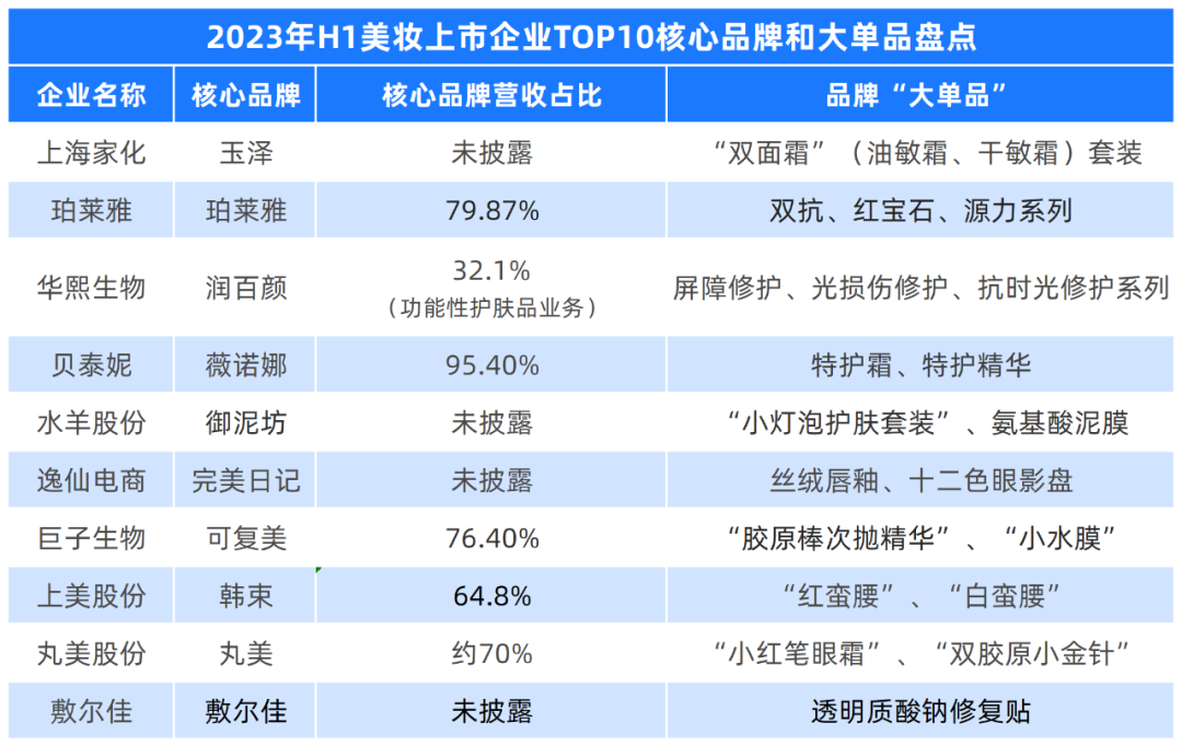盤點今年上半年美妝上市公司的財報,可以發(fā)現(xiàn),“核心品牌”和“大單品”是當前美妝企業(yè)保持穩(wěn)定增長的基本盤。如貝泰妮、珀萊雅、巨子生物、華熙生物、上美集團等美妝企業(yè),均呈現(xiàn)出這一趨勢。