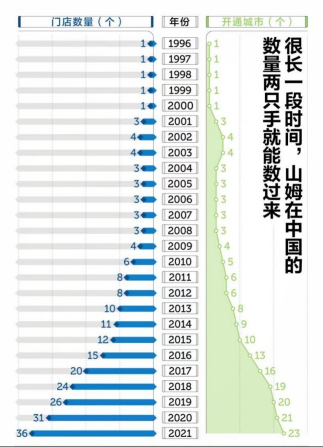(1)山姆,進(jìn)入25個(gè)城市,開(kāi)設(shè)45個(gè)門(mén)店,保持著每年開(kāi)出約5家新店的速度。