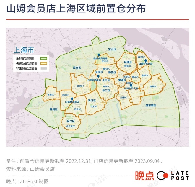 (3)當(dāng)每日優(yōu)鮮、叮咚買(mǎi)菜在全國(guó)鋪設(shè)前置倉(cāng),山姆也開(kāi)始設(shè)立前置倉(cāng),由京東的達(dá)達(dá)獨(dú)家配送。在多個(gè)城市主要城區(qū),山姆已可實(shí)現(xiàn)1小時(shí)配送到家。