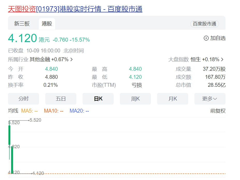 截止10月9日收盤,天圖投資股價4.12港元,距離發(fā)行價下跌36.62%。