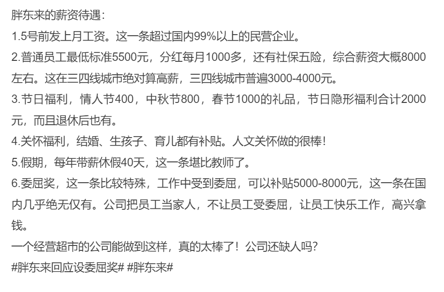 胖東來在職或離職員工,在互聯(lián)網(wǎng)各大社交平臺(tái)留下了這樣的反饋: