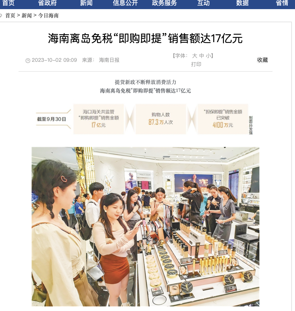 海南:離島免稅8天銷售額13.3億,日均銷售約1.7億元。