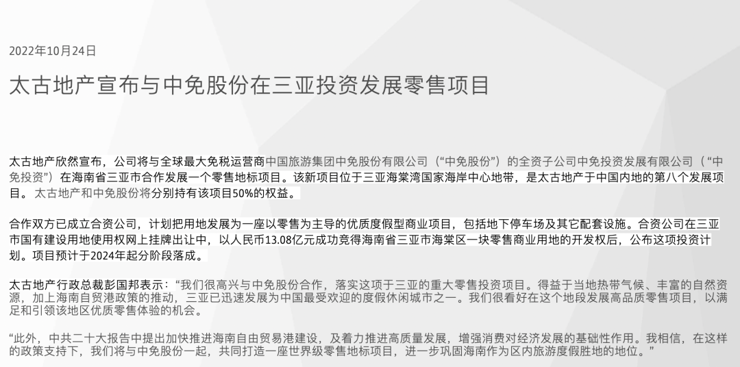 去年10月24日,太古地產(chǎn)宣布,將與中免合作,在海南三亞合作發(fā)展一個(gè)零售地標(biāo)項(xiàng)目。太古地產(chǎn)和中免股份將分別持有該項(xiàng)目50%的權(quán)益。