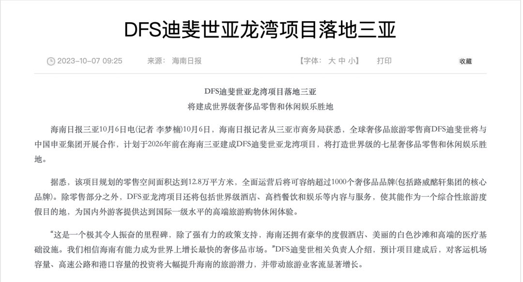 近日,LVMH旗下奢侈品旅游零售商DFS迪斐世宣布,與申亞集團(tuán)合作,將于2026年前建成海南首個(gè)世界級的七星奢侈品零售和休閑娛樂勝地——DFS迪斐世亞龍灣項(xiàng)目。