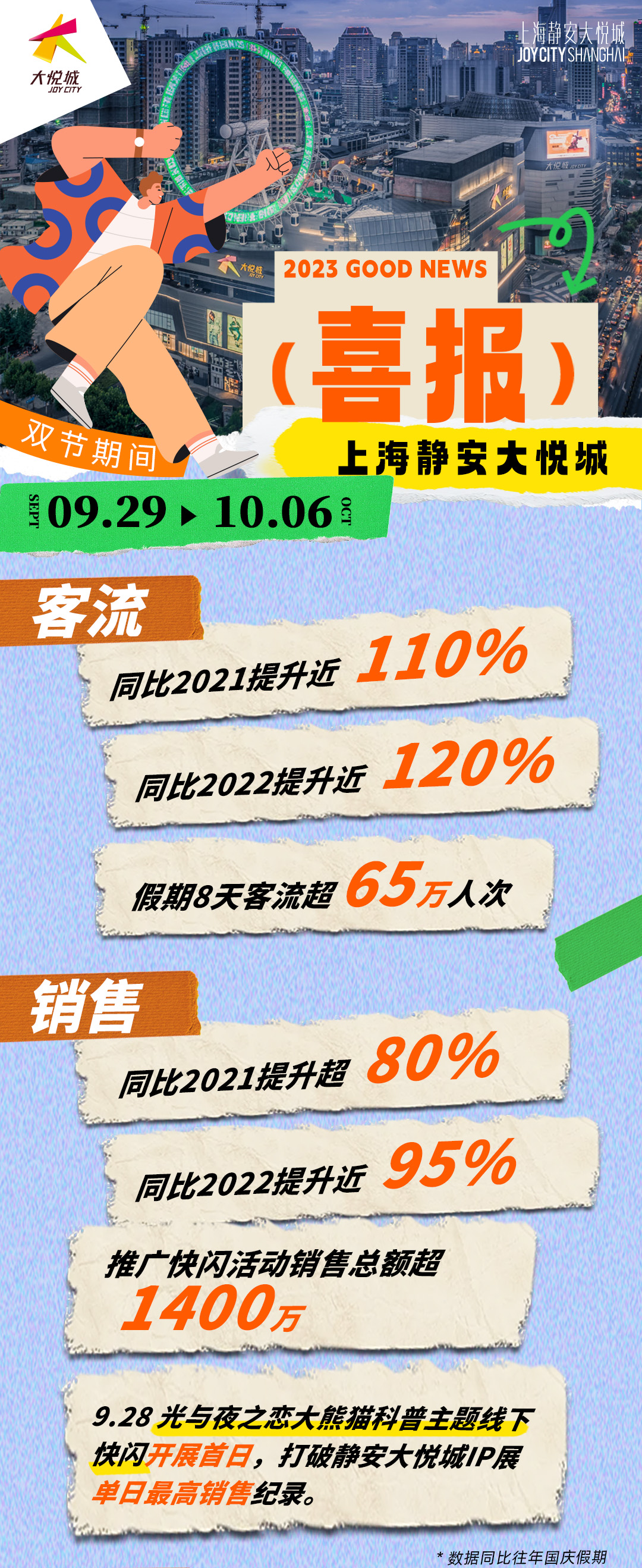 ·青浦百聯奧特萊斯假日8天實現銷售額超3.1億元;虹橋天地銷售額同比增長60%以上,相較2019年同期增長35%以上;元祖夢世界商業(yè)零售額同比增長60%以上;靜安大悅城95%以上……