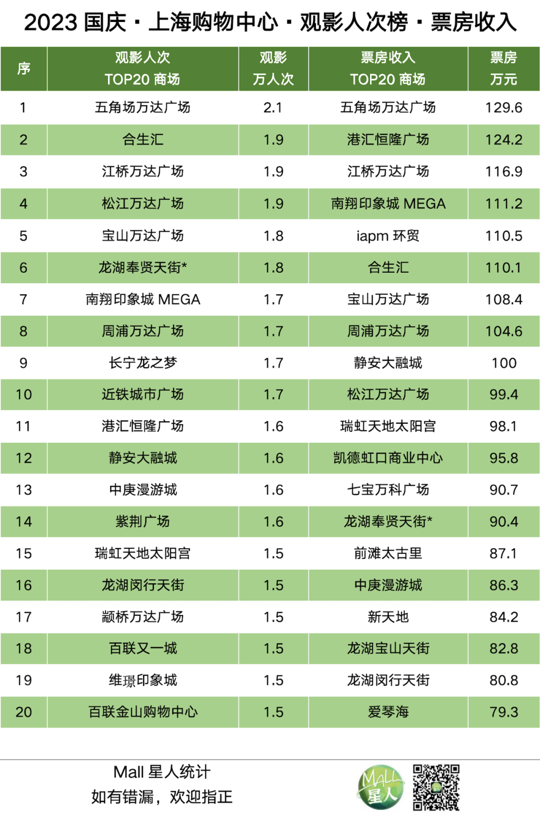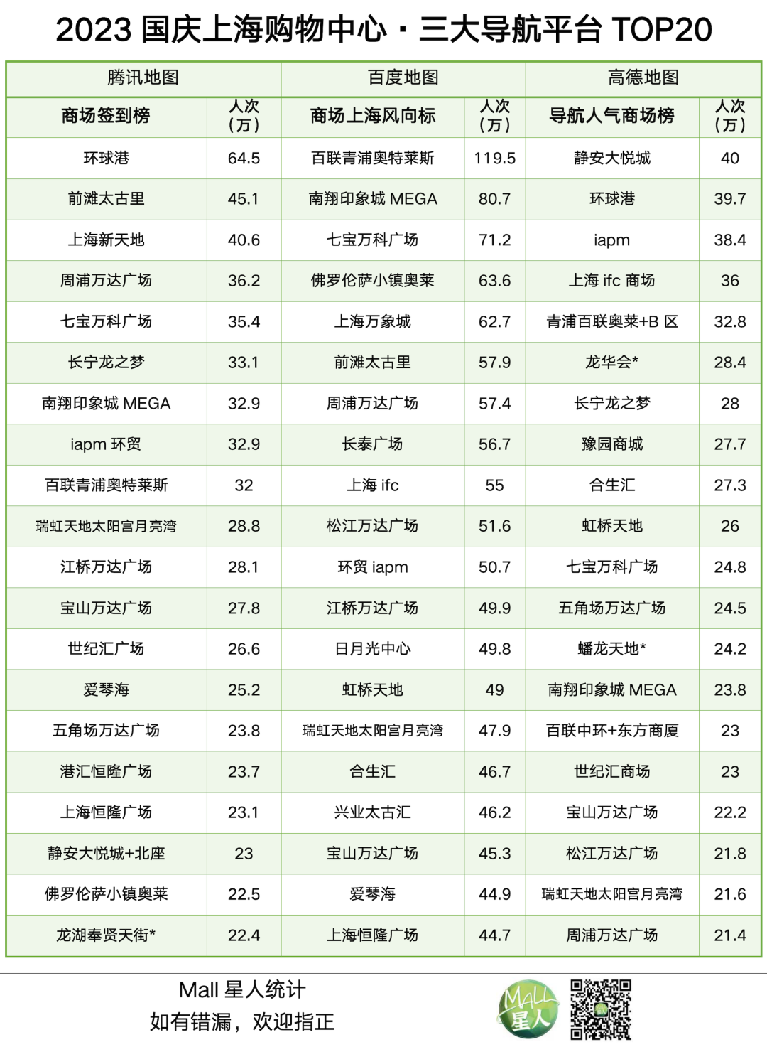 Mall星人整理了一份2023國慶期間上海商場人氣榜榜單,以大眾點評、貓眼、高德、百度地圖和騰訊地圖等平臺的數據為依據,從個五大維度窺見國慶長假的人氣商場排名。除這部分數據外,其它數據來自各區(qū)發(fā)布及各項目方等渠道(本文排名均不分先后)。