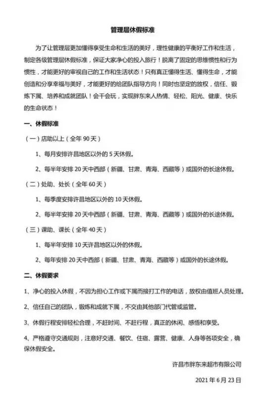 不久前,于東來在2023中國超市周活動中發(fā)表演講時還怒斥“加班”文化,表示“在胖東來加班就是不行,是占用別人成長機會、剝奪別人的時間”。據(jù)悉,胖東來嚴格貫徹員工每天工作6-7小時,每周二下午閉店休息,節(jié)假日也不會強制加班。