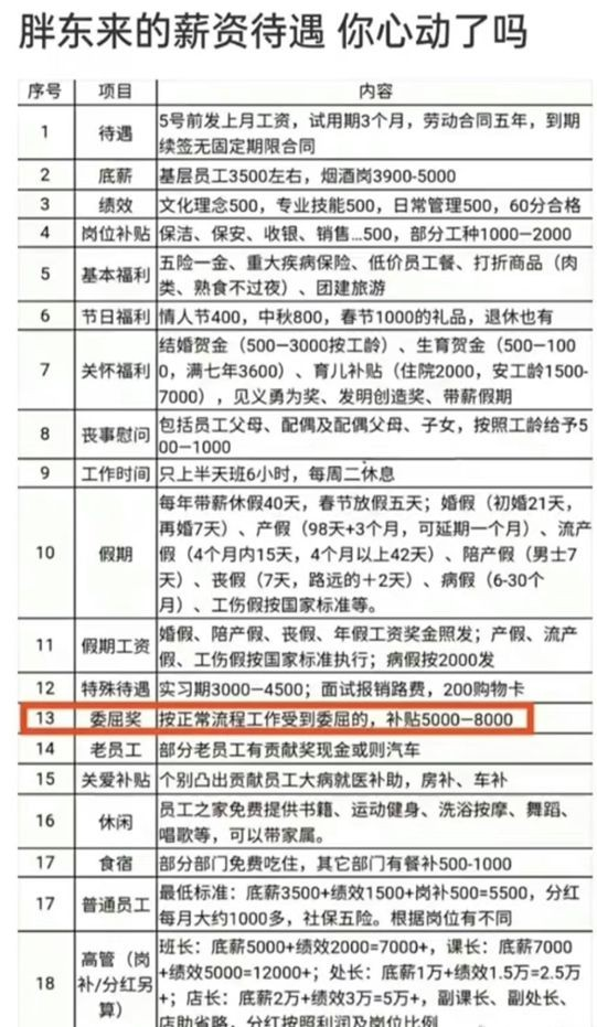 據(jù)說胖東來的工資福利有18個項目,這源于一張網(wǎng)上流傳的薪資結(jié)構(gòu)圖?梢钥吹,普通員工的最低薪資標準是底薪3500+績效1500+崗補500,總共是5500元,此外每月還有分紅1000元多;課長底薪7000元+績效5000元,薪資在12000元以上;店長底薪2萬+績效3萬,薪資超過5萬元。
