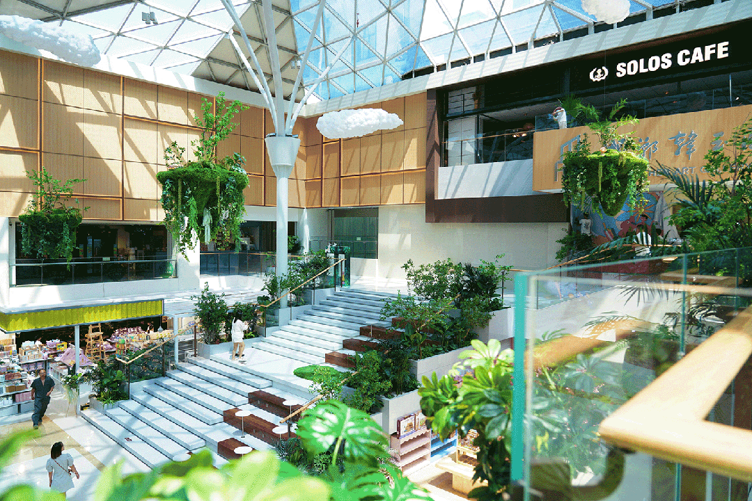 其一、空間的融合。打破了以往只有一個(gè)中庭到頂?shù)某R?guī)模式,打造了三個(gè)不同風(fēng)格的跨層中庭,其中一樓至三樓大中庭,四樓和七樓各有一個(gè)中庭空間。尤其是七樓的“陽(yáng)光山谷”跨層主題空間,將自然生態(tài)的綠植元素和本地的河川山谷地貌滲透其中,把自然河谷的流線設(shè)計(jì)與室內(nèi)整體動(dòng)線的層次結(jié)合,既是對(duì)在地文化的靈活運(yùn)用,也有助于消費(fèi)者在高節(jié)奏的工作之余能在“都市綠洲”中釋放情緒。同時(shí),大面積階梯的設(shè)置也為顧客提供了休息區(qū)域,增加了商場(chǎng)的游逛體驗(yàn)。