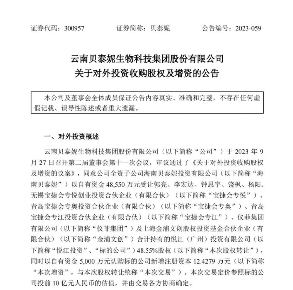 近期,貝泰妮發(fā)布《公司關于對外投資收購股權及增資的公告》,宣布旗下全資子公司海南貝泰妮投資有限公司(以下簡稱“海南貝泰妮”)將以自有資金4.855億元,收購悅江(廣州)投資有限公司(以下簡稱“悅江投資”)48.55%股權,同時以自有資金0.5億元認購悅江投資新增注冊資本12.4279 萬元。