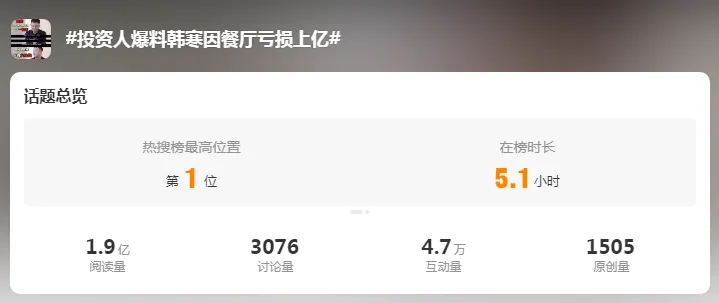 10月11日,#投資人爆料韓寒因餐廳虧損上億# 沖上熱搜。