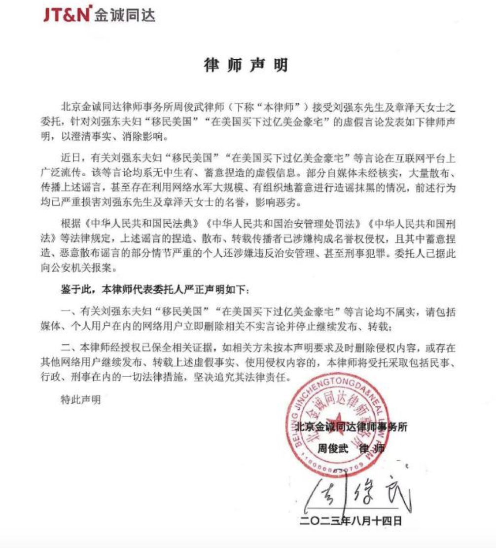在8月份的時(shí)候,也曾有劉強(qiáng)東章澤天夫婦 “移民美國”“在美國買下過億美金豪宅〞等言論在互聯(lián)網(wǎng)平臺(tái)上廣泛流傳。當(dāng)時(shí),京東也及時(shí)辟謠,稱該等言論均系無中生有、蓄意捏造的虛假信息。部分自媒體未經(jīng)核實(shí),大量散布傳播上述謠言,甚至存在利用網(wǎng)絡(luò)水軍大規(guī)模、有組織地蓄意進(jìn)行造謠抹黑的情況,京東已據(jù)此向公安機(jī)關(guān)報(bào)案。