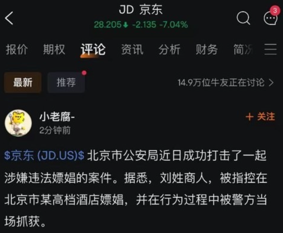聯(lián)商快訊:近日,一則謠言出現(xiàn)在京東股票的評(píng)論區(qū),并對(duì)股價(jià)產(chǎn)生了不利影響。