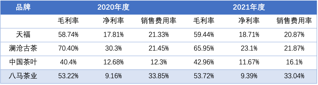 在這樣的市場(chǎng)增速下,八馬茶業(yè)的凈利率卻僅維持在10%上下,對(duì)比同行業(yè)公司處于較低水平。究其原因,除八馬茶業(yè)的自采比例較高外,或也因其始終高昂的銷(xiāo)售費(fèi)用。
