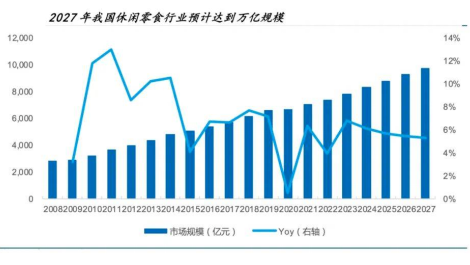 根據(jù)研報數(shù)據(jù)顯示,我國休閑零食市場在2022年前的12年間的確經(jīng)歷從4100億到11654億元的高增幅,但在2023年后預(yù)計保持著不足5%的低位增長率。