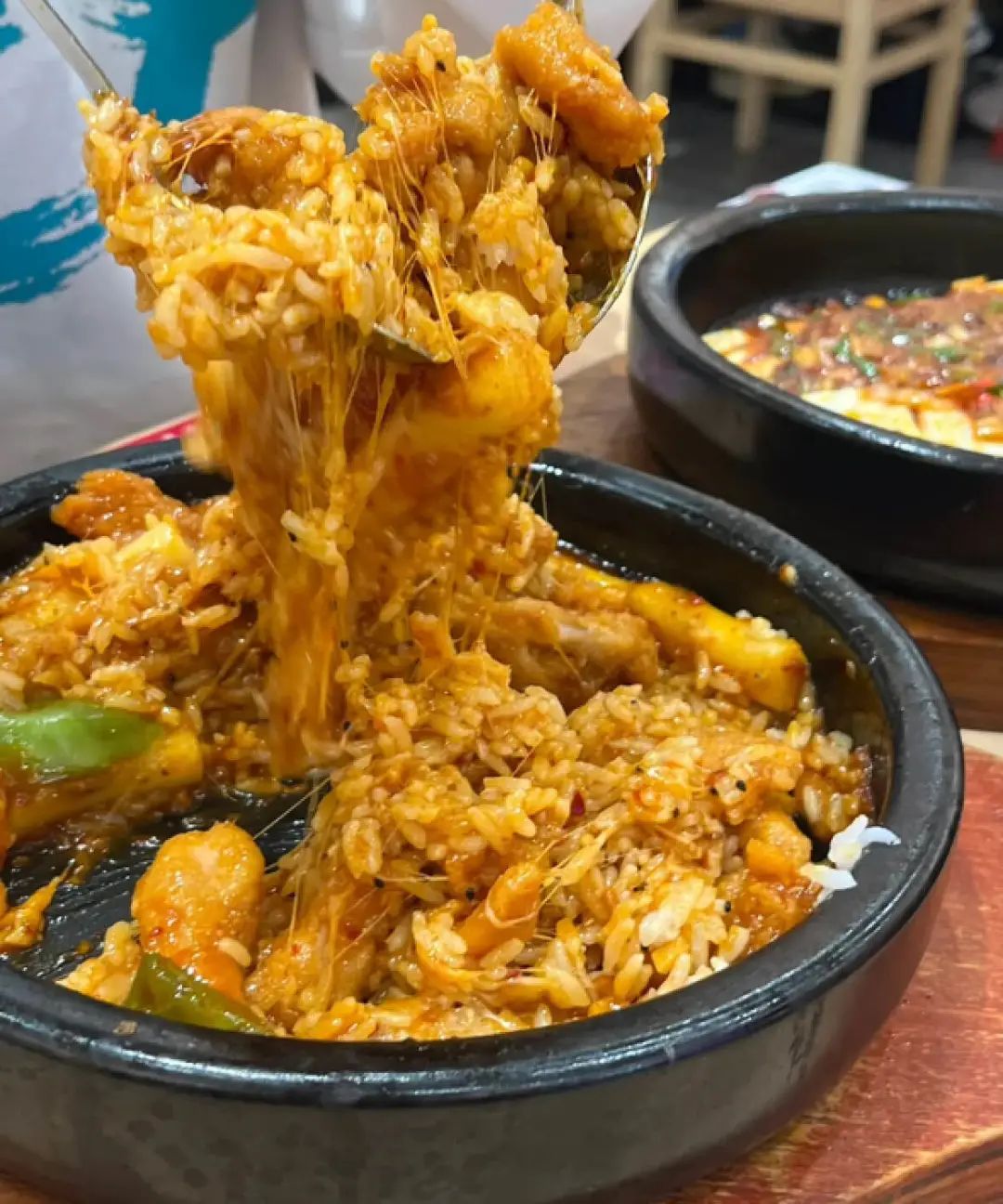 但這不是點外賣唯一的缺憾。因為米村拌飯到店吃還能感受一場【預制菜的現(xiàn)制表演賽】——飯菜放在鐵板或者砂鍋上,端到你前面的時候還冒著熱騰騰的蒸汽。