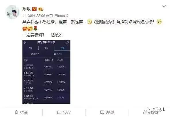 2018年4月,《溫暖的弦》收視率開門紅,上線9天,網(wǎng)播量累計21.1億,陳歐還就此發(fā)了微博。
