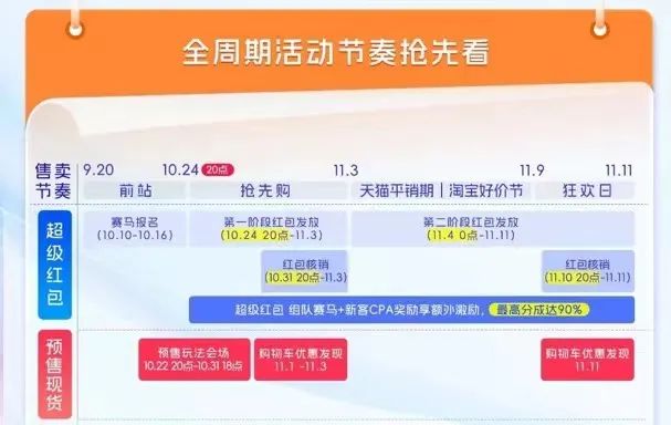此次大促整體被分為3個(gè)階段,9月28日商家報(bào)名通道正式開(kāi)啟至10月20日零點(diǎn)為蓄水期,10月20日至11月11日為正式期,11月12日則為大促返場(chǎng)期。
