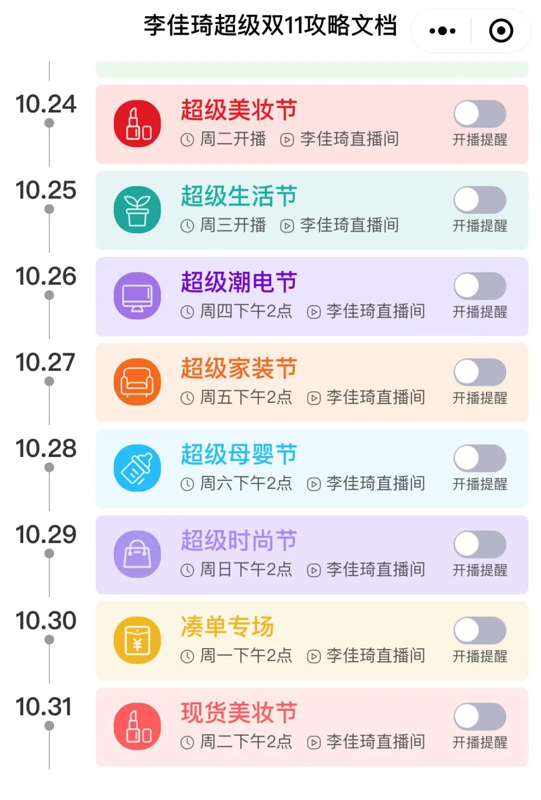 目前李佳琦雙十一的直播活動(dòng)暫時(shí)預(yù)告到10月30日。