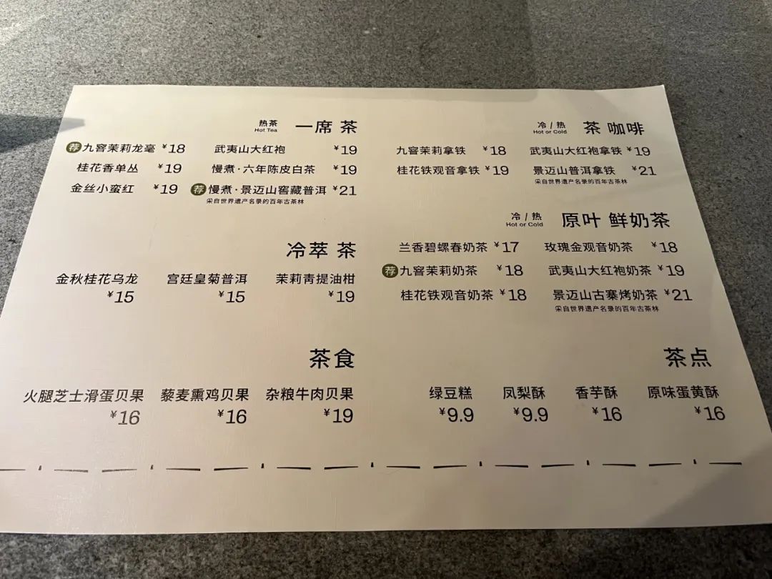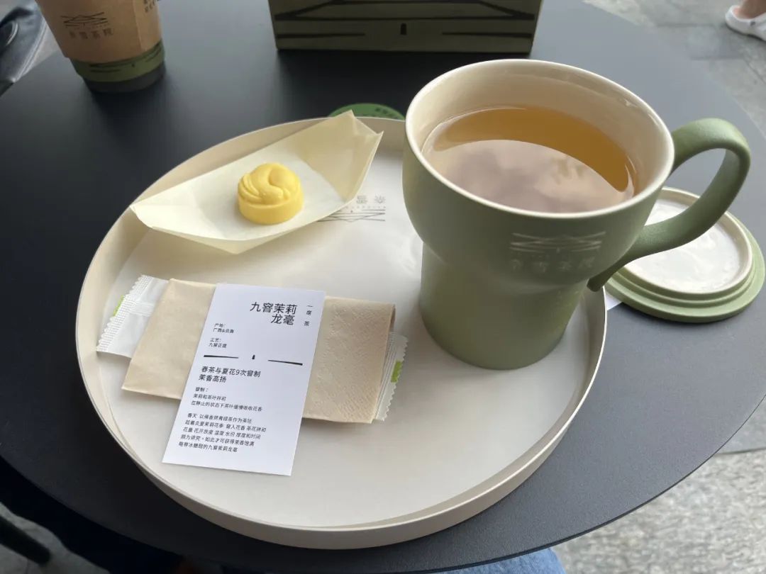 趁著開業(yè)優(yōu)惠“9.9元喝茶”,筆者也點了九窨茉莉龍毫,值得注意的是,只有一席茶才送茶點,并且一席茶不能打包,只能堂食。
