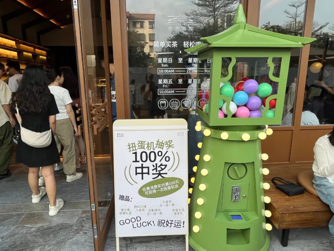 此外,還有扭蛋機(jī)抽獎。奈雪茶院門口有一個扭蛋機(jī),消費金額滿100元可以參與抽獎。不過筆者去的當(dāng)天倒是沒怎么看到抽獎的消費者,可見度過開業(yè)高峰期店里的消費者整體的客單價應(yīng)該并不算高。
