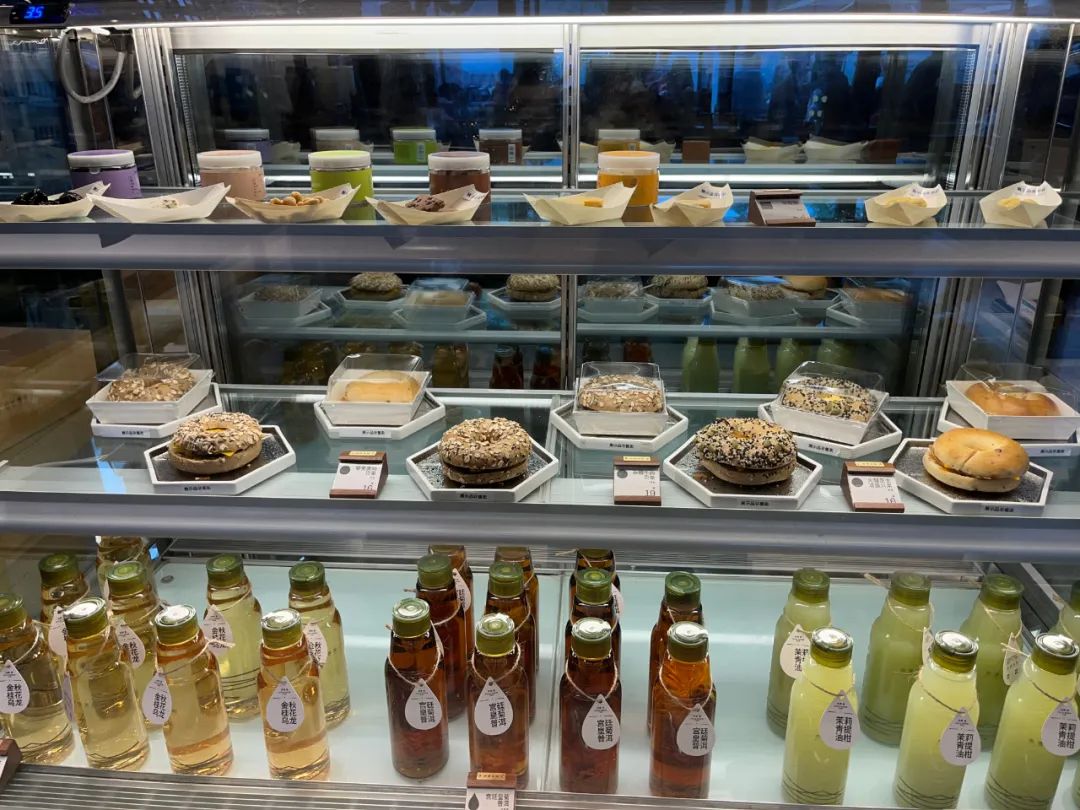 點單臺左側(cè)是茶點展示區(qū),有茶點以及貝果等甜品,種類并不多;右側(cè)是取餐區(qū)。因為已經(jīng)過了開業(yè)高峰期,店內(nèi)雖未限流排隊,但一直都有人來點單。