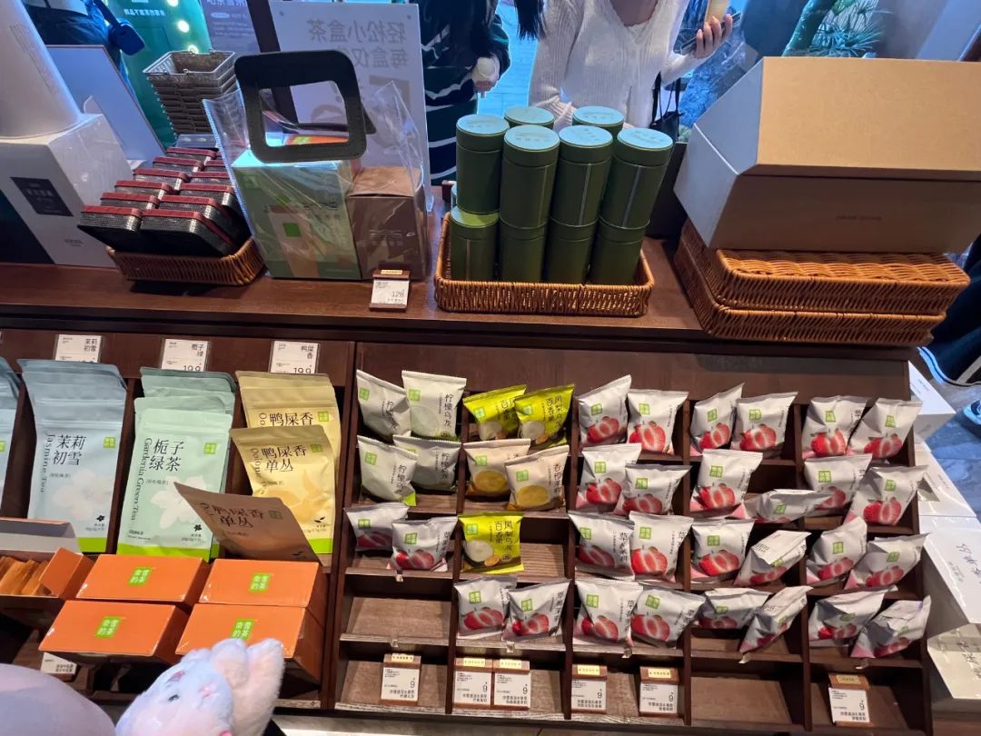 進(jìn)到室內(nèi),有兩個展示架,貨架最顯眼的位置擺放著主打產(chǎn)品小盒茶,以及各種罐裝茶、禮盒茶以及茶具、茶點等產(chǎn)品。