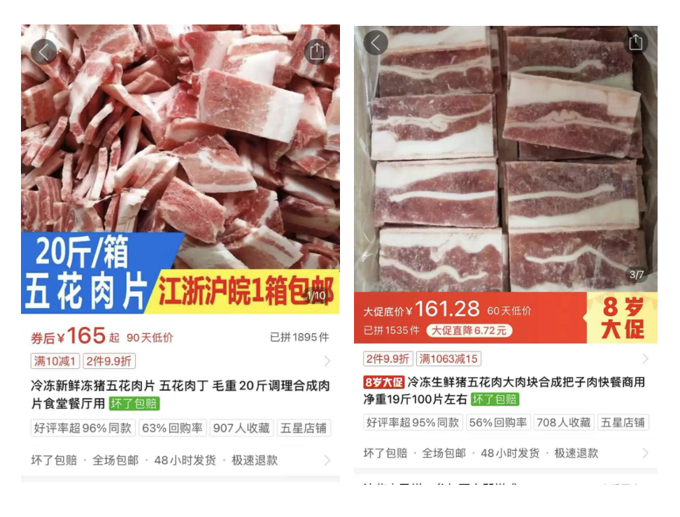 打開拼多多,隨處可見100多塊錢20斤的合成五花肉,滿滿的科技與狠活,商品信息里還赤裸裸標注著“餐廳食堂用”“快餐商用”。