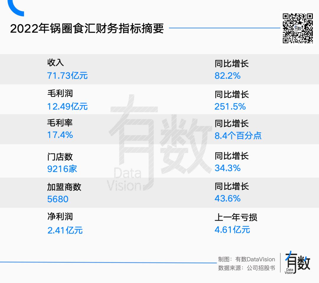 據(jù)招股書,鍋圈食匯在2022年成功扭虧,其營(yíng)收同比增長(zhǎng)81%達(dá)71.73億元,毛利同比增長(zhǎng)251%達(dá)12.49億元,凈賺2.41億[1]。