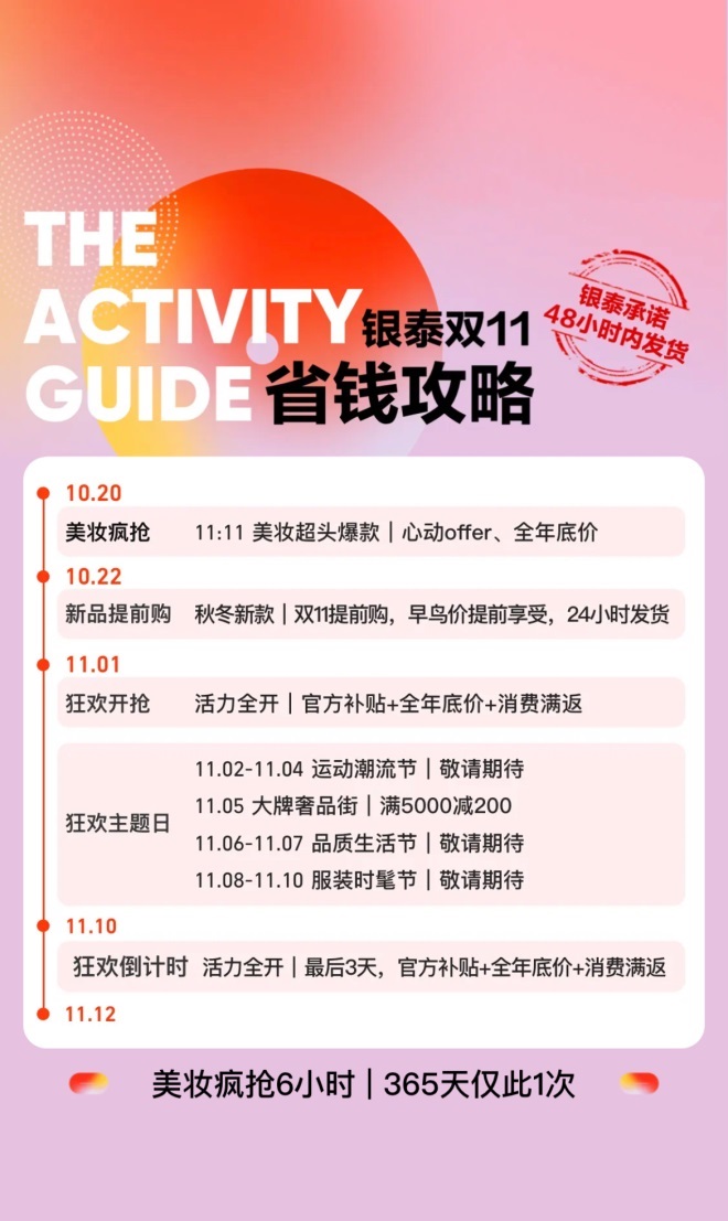 在線下,另一經(jīng)典活動(dòng)也讓消費(fèi)者能夠先享雙11的價(jià)格,即買(mǎi)即享。不湊單、不熬夜、即買(mǎi)即用,開(kāi)場(chǎng)即好價(jià)。10月25日起,銀泰百貨在杭州、寧波、溫州、合肥、西安等城市的六家門(mén)店可參與活動(dòng)。顧客在活動(dòng)參與門(mén)店按照吊牌價(jià)全額支付預(yù)購(gòu)訂單,INTIME365會(huì)員以對(duì)應(yīng)的會(huì)員權(quán)益9折支付預(yù)購(gòu)訂單,11月14日起銀泰百貨將按11月11日折扣結(jié)算,返還差額至原支付賬戶。