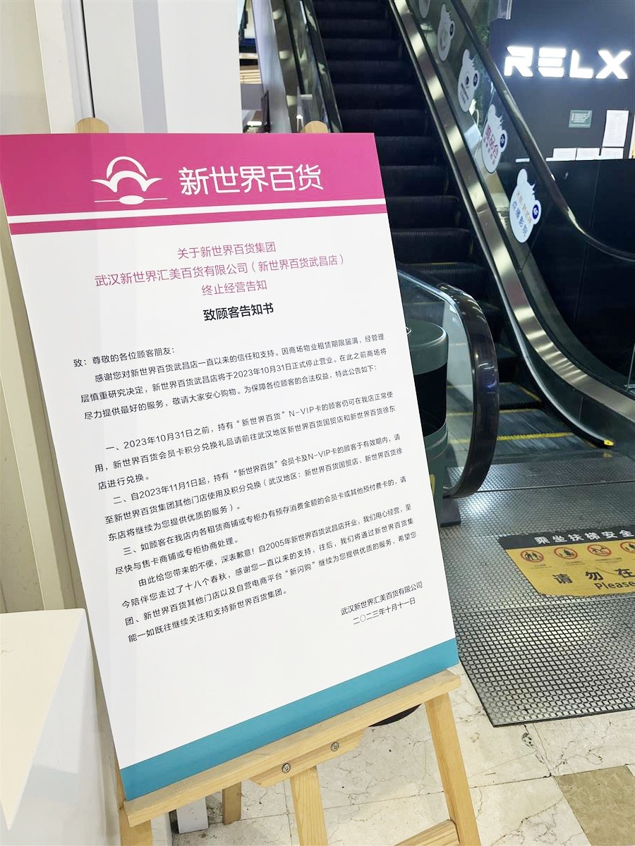 據(jù)《致顧客告知書》顯示,因商場物業(yè)租賃期限屆滿,經(jīng)管理層慎重研究決定,新世界百貨武昌店將于2023年10月31日正式停止營業(yè)。2023年10月31日之前,持有“新世界百貨”N-VIP卡的顧客仍可在店內(nèi)正常使用,新世界百貨會員卡積分兌換禮品請前往武漢地區(qū)新世界百貨國貿(mào)店和新世界百貨徐東店進行兌換。
