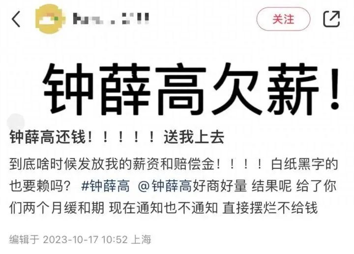 據(jù)潮新聞報(bào)道,有自稱鐘薛高客服部門“前員工”的網(wǎng)友表示,在公司效益不好優(yōu)化期間,該員工等6人與公司人事提出優(yōu)化補(bǔ)償,并簽署了離職同意單,約定補(bǔ)償金和工資10月15日發(fā)放,當(dāng)天公司未履約。該員工討要說法,“公司回復(fù)賬戶上沒有錢補(bǔ)償,說要等,沒有具體的時(shí)間點(diǎn)!