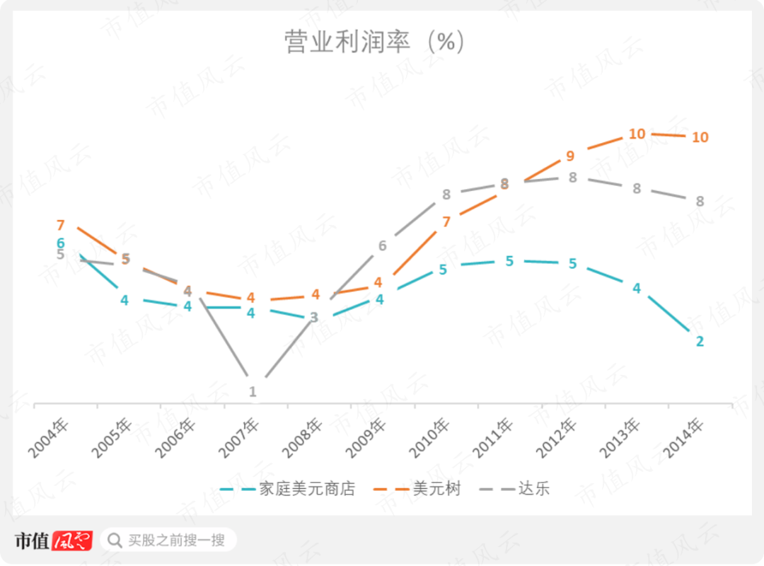 實(shí)際上,當(dāng)時(shí)美國(guó)上市的三家硬折扣零售公司里,家庭美元商店的營(yíng)業(yè)利潤(rùn)率是最低的,截至2014年收購(gòu)時(shí),甚至下滑至2%,遠(yuǎn)低于美元樹(shù)的10%和達(dá)樂(lè)(DG.N)的8%。