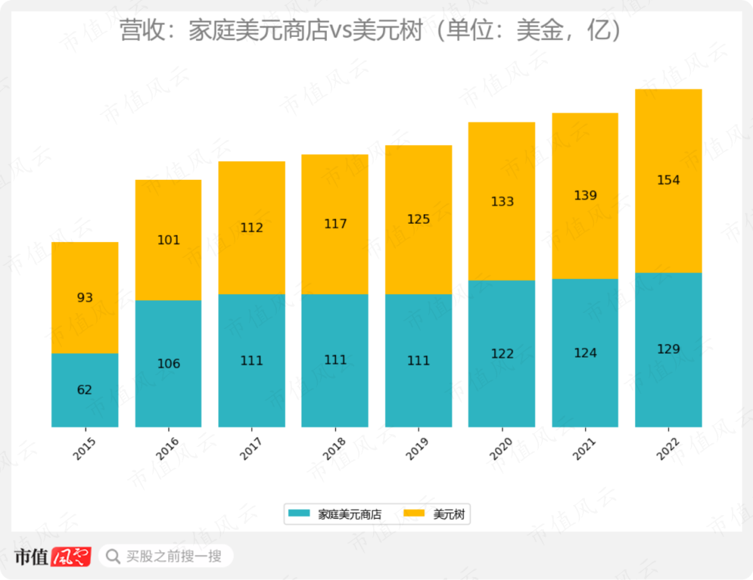 收購(gòu)后,家庭美元商店并沒(méi)有給公司帶來(lái)想要的增長(zhǎng)。2016-22年間,美元樹(shù)原有業(yè)務(wù)的營(yíng)收從101億增長(zhǎng)至154億,CAGR為7.22%,而收購(gòu)后的家庭美元商店的營(yíng)收從106億增長(zhǎng)至129億,CAGR僅為3.38%。