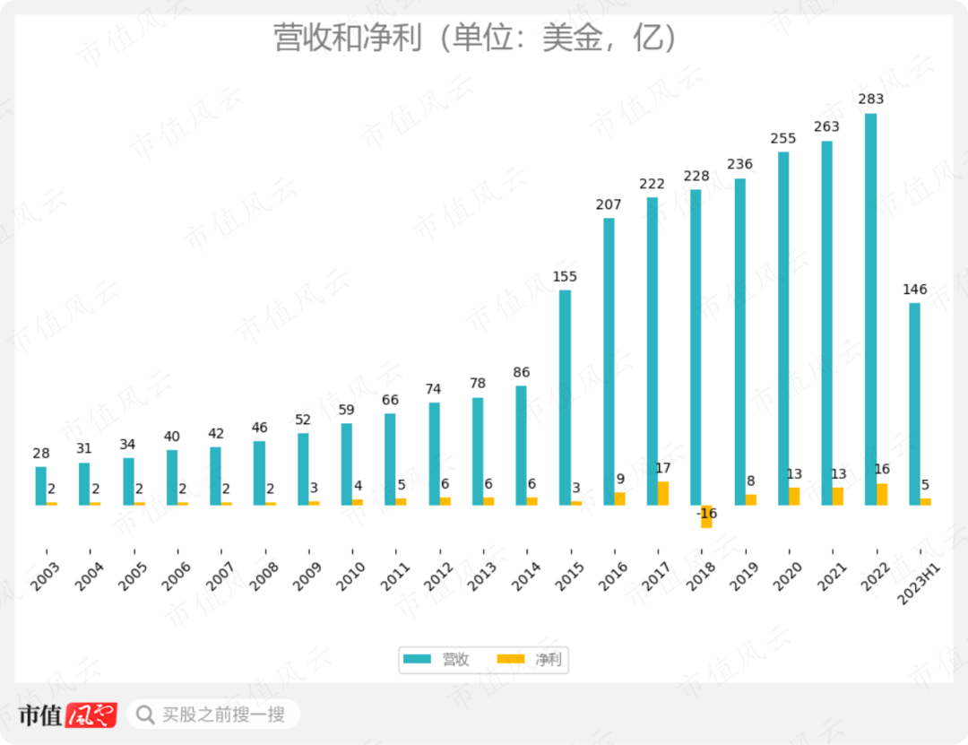 在過(guò)去20年的大趨勢(shì)上,公司的毛利率、營(yíng)業(yè)利潤(rùn)率、凈利潤(rùn)率都在下滑。截至2023年H1,三項(xiàng)數(shù)據(jù)分別為29.86%、3.93%、3.41%。