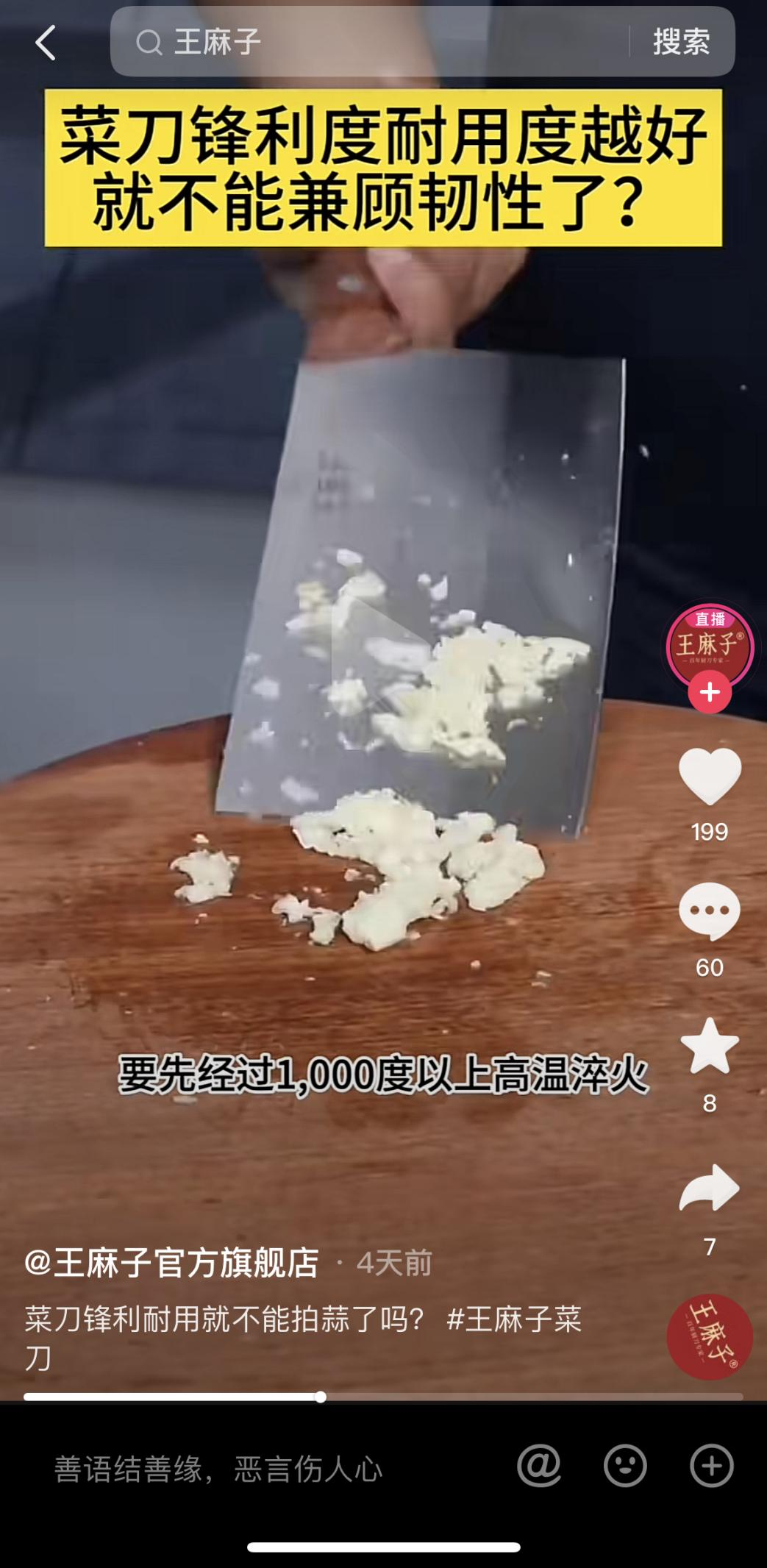 而在此次的“拍蒜斷刀”事件后,王麻子又發(fā)布了一條標(biāo)題為“菜刀鋒利度耐用度越好,就不能兼顧韌性了?”的視頻,視頻中展示的菜刀不僅鋒利,而且還能大力拍蒜、拍黃瓜,甚至拍冰塊。