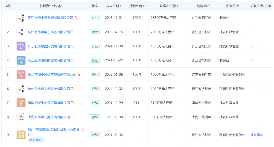企查查數(shù)據(jù)顯示,張小泉股份有限公司共投資有9家公司,其中7家為全資持股,版圖涉及電子商務(wù)、智能家居、智能制造、國際貿(mào)易、供應(yīng)鏈管理等。