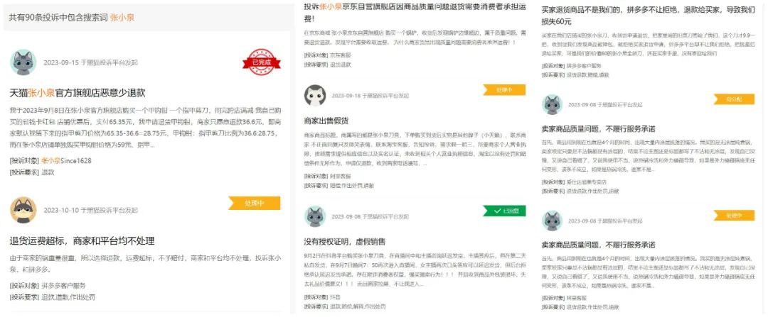 在黑貓投訴平臺上,關(guān)于張小泉菜刀的投訴量,從去年的10余條增加至90條,投訴內(nèi)容包括工具斷裂、卷刃、菜刀為殘次品、出售假貨等。