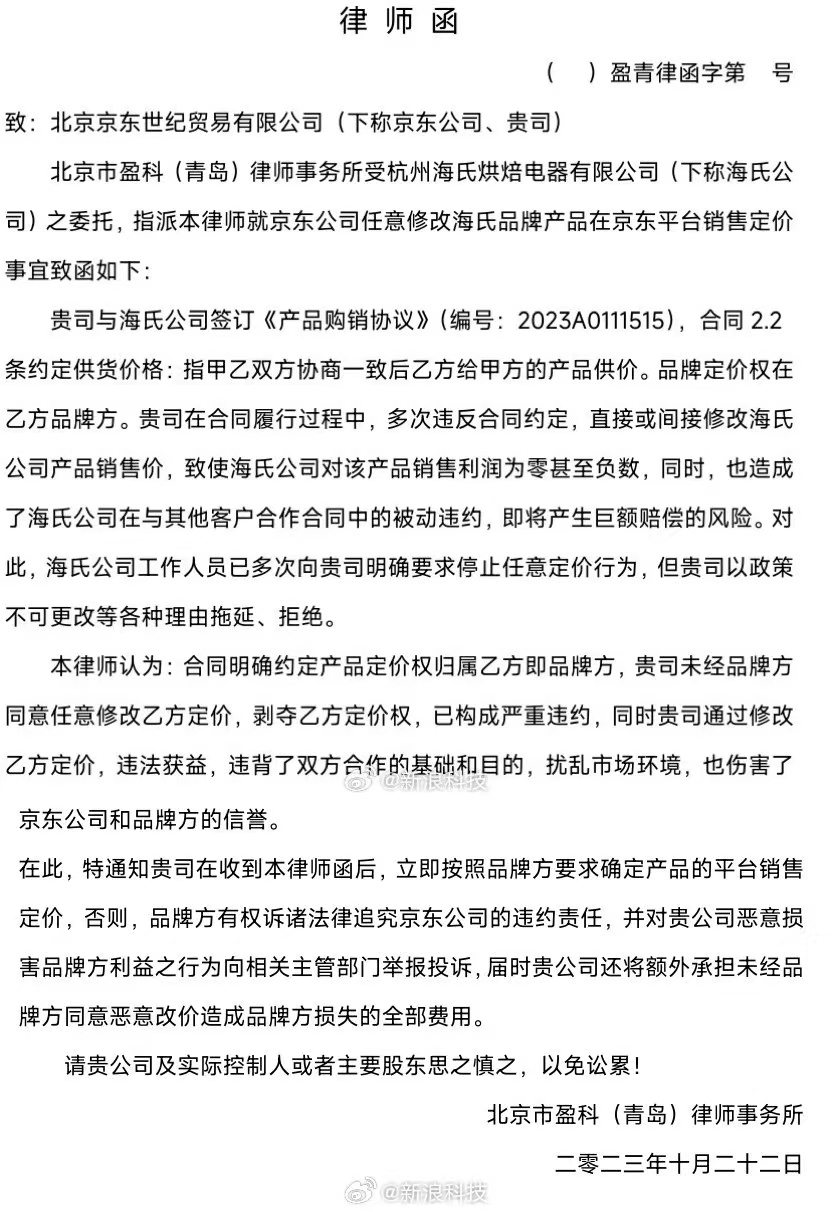 根據(jù)該工作人員提供的律師函,海氏方面表示,京東多次違反合同約定,直接或間接修改海氏產(chǎn)品銷售價(jià),同時(shí),也造成了海氏公司在與其他客戶合作合同中的被動(dòng)違約,即將產(chǎn)生巨額賠償?shù)娘L(fēng)險(xiǎn)。