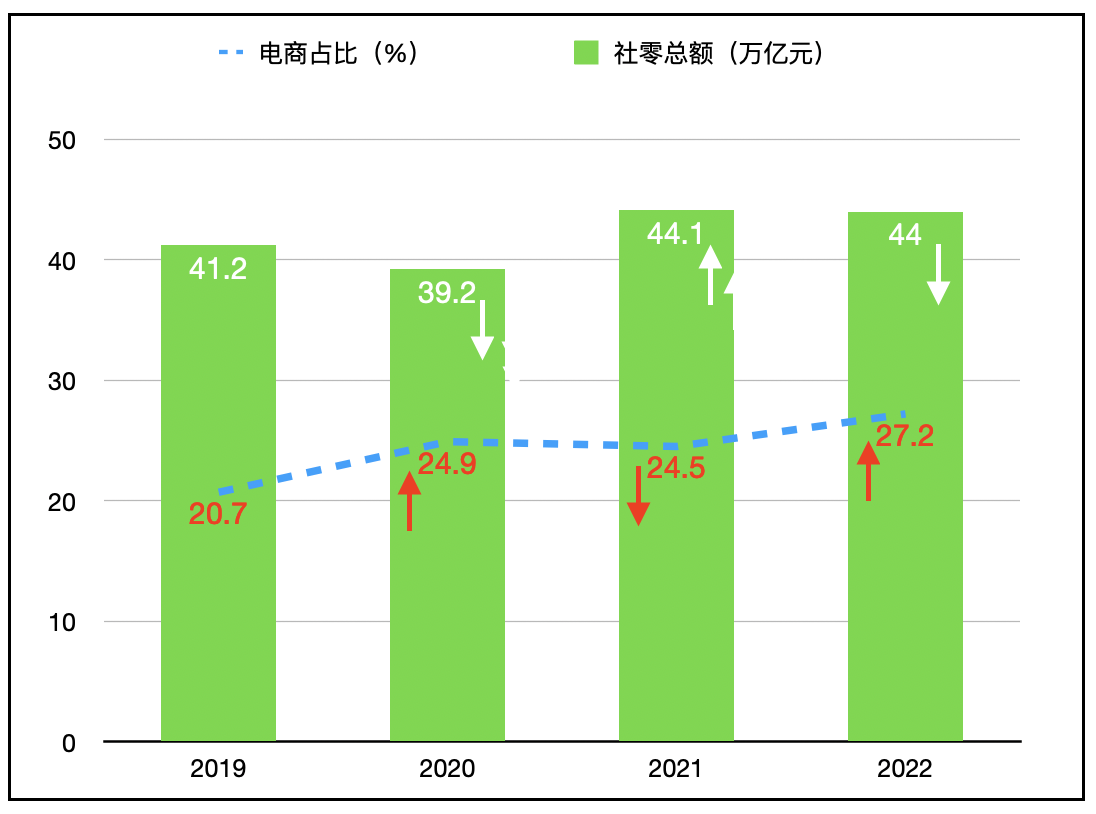 由圖1明顯可見,由于2020年初的新冠疫情爆發(fā),2020年的社零總額的39.2萬億元相較于2019年的41.2萬億元下降約10個百分點,而同時間電商占比從20.7%躍升到24.9%,直接躍升4.2個百分點,躍升幅度為自2012年到2019年的最高,之前每年的電商占比的增長都是在2個百分點左右;2021年是疫情期間經(jīng)濟恢復較好的一年,社零總額回升到44.1萬億元,增長超過兩位數(shù),而同時期的電商占比從之前的24.9%降至24.5%,下降0.4個百分點;2022年由于奧密克戎病毒的蔓延和嚴密的封控,社零總額的44.0萬億相較于2021年的44.1萬億沒有增長,還有所下降,而同時期電商占比則從之前的24.5%升至27.2%,躍升幅度接近3個百分點。27.2%的電商占比也為2012年開始的長達10年之久的馬王之賭畫上了句號。應該說如果沒有肆虐的新冠疫情特別是2022年的奧密克戎,馬王打賭的最后結(jié)果應該就在25%左右。新冠疫情在很大程度上成為了國內(nèi)電商發(fā)展的催化劑。